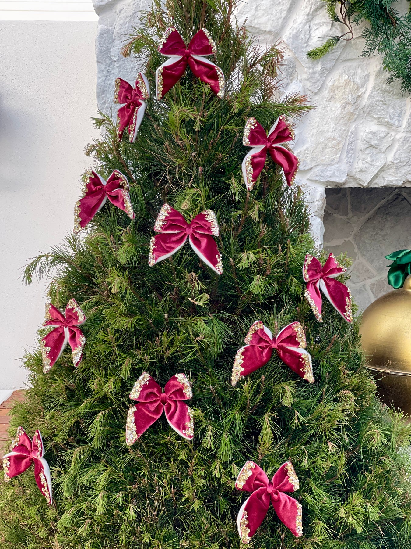 This red velvet bow is finished with a gold embellishment, adding a touch of luxury and festive elegance to any table setting or Christmas tree. Clip at back for fastening.