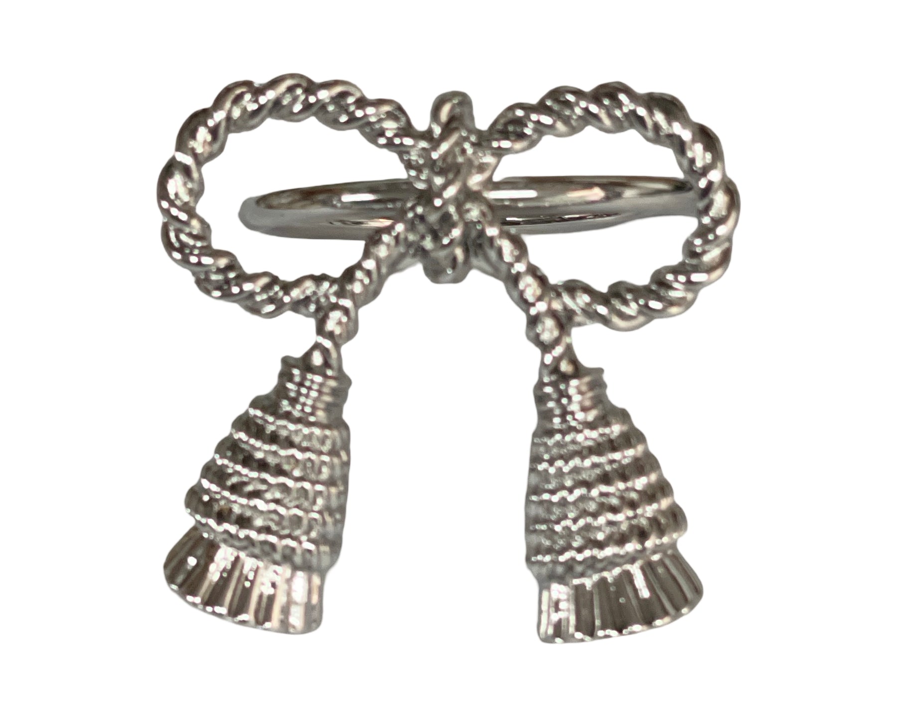 This silver napkin ring features an elegant bow design with delicate tassels, adding a refined and decorative touch to any table setting.